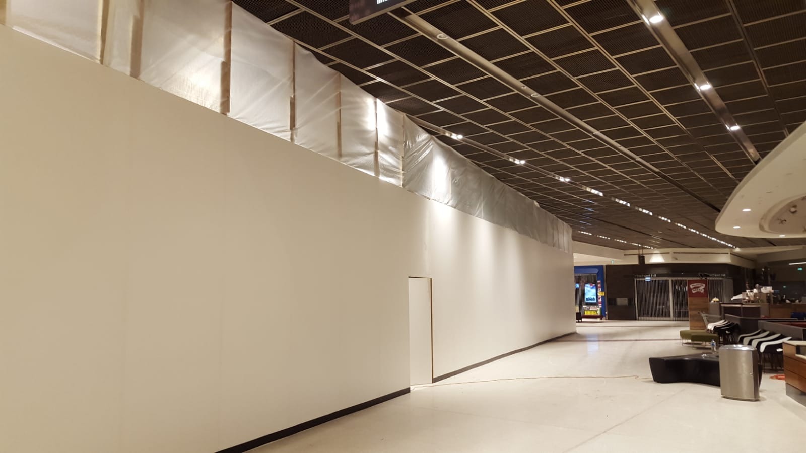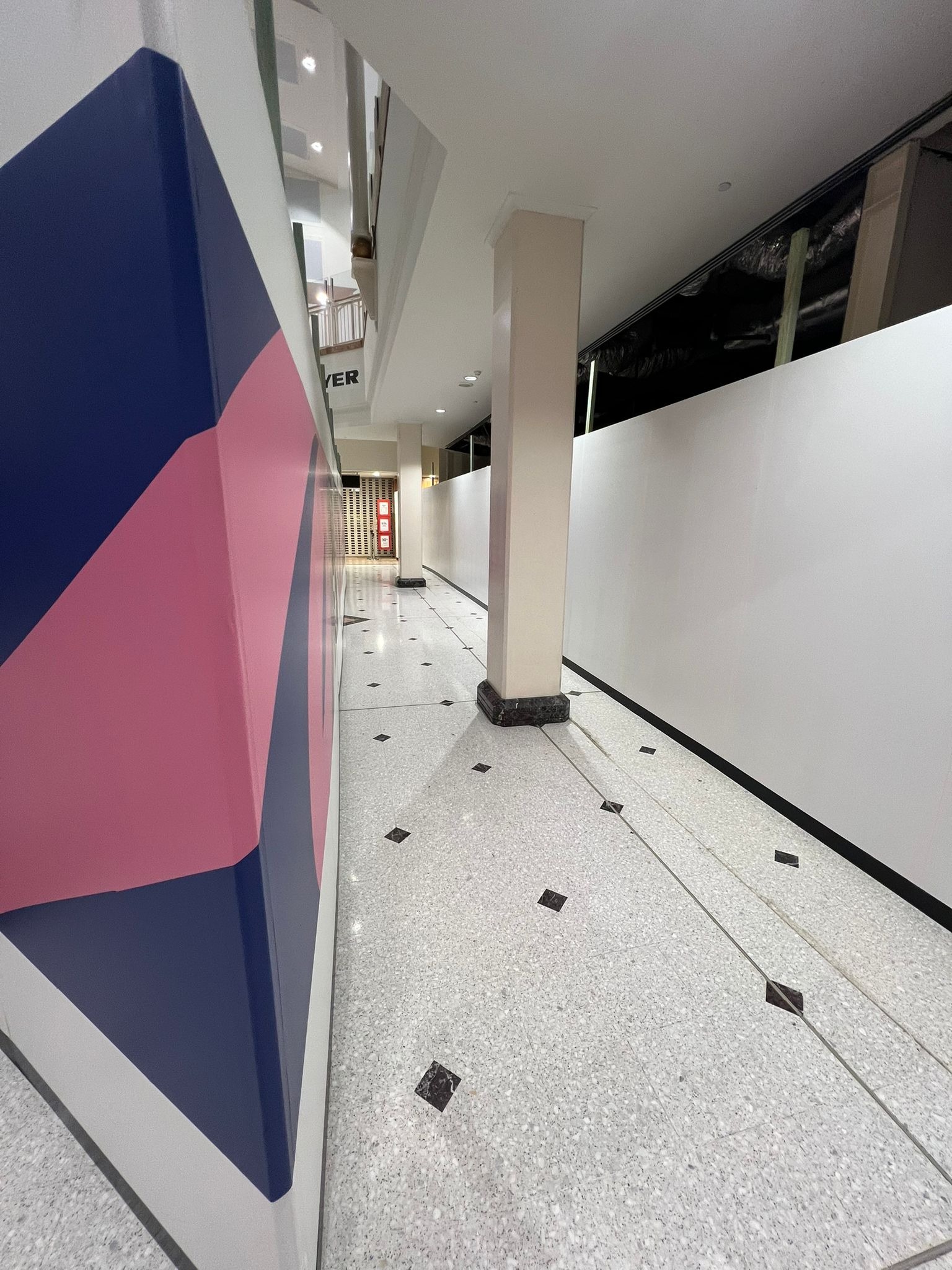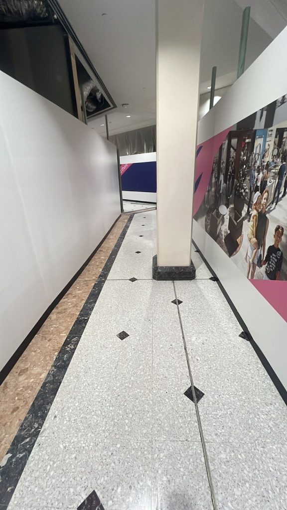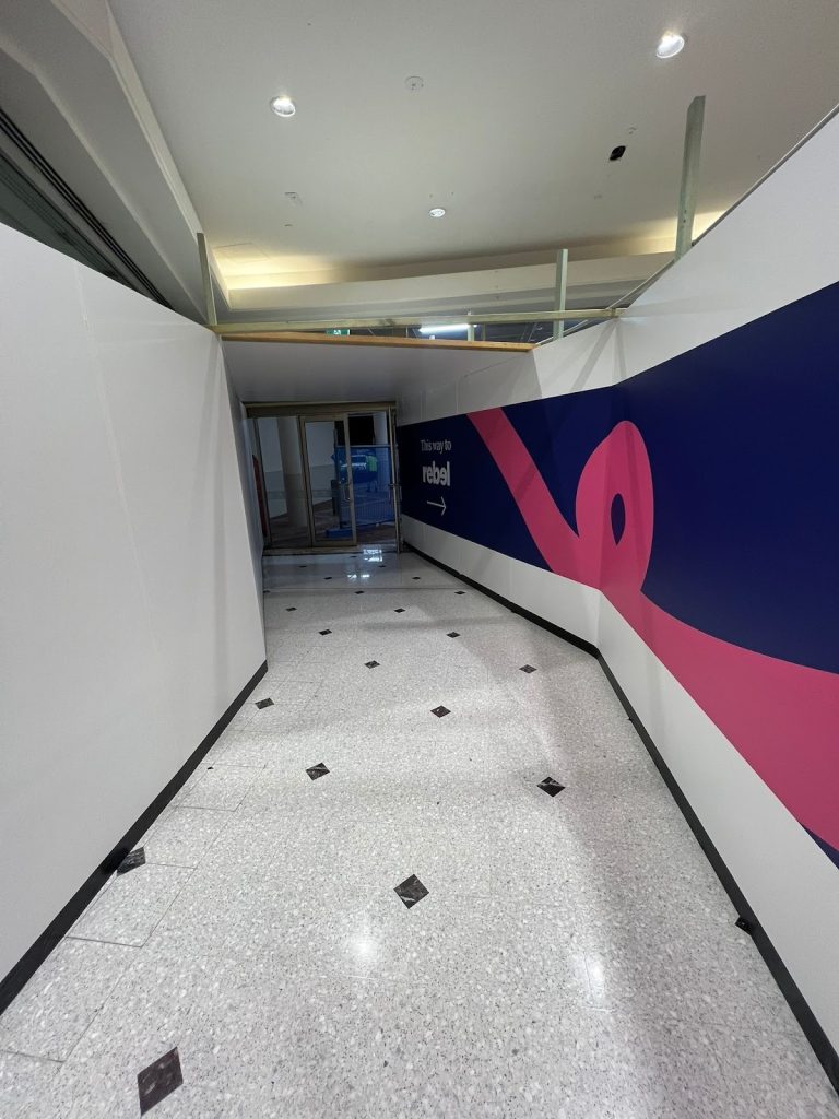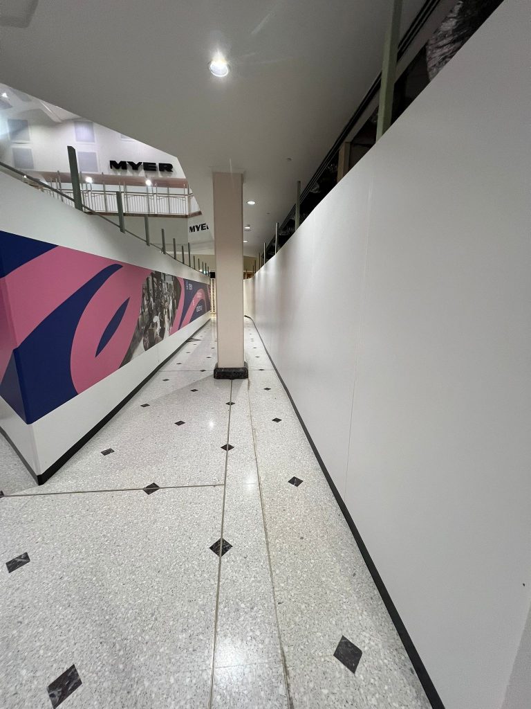 Maintenance projects within shopping centres or commercial buildings frequently use controlled shopfront-style hoarding to isolate work zones while allowing business operations to continue.