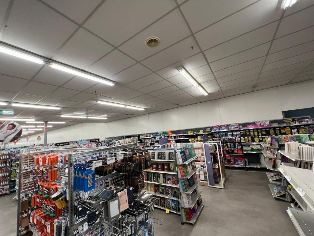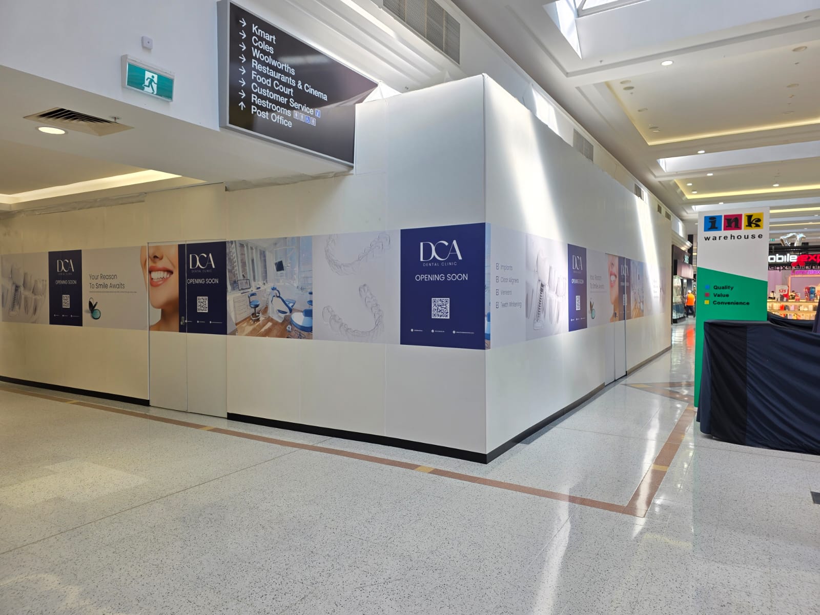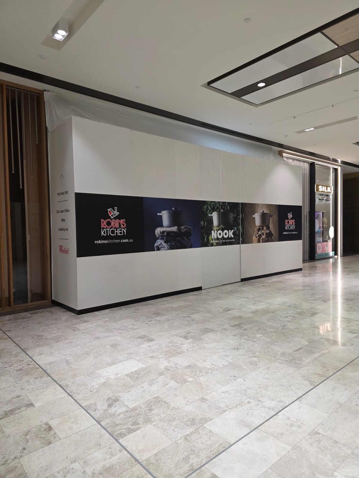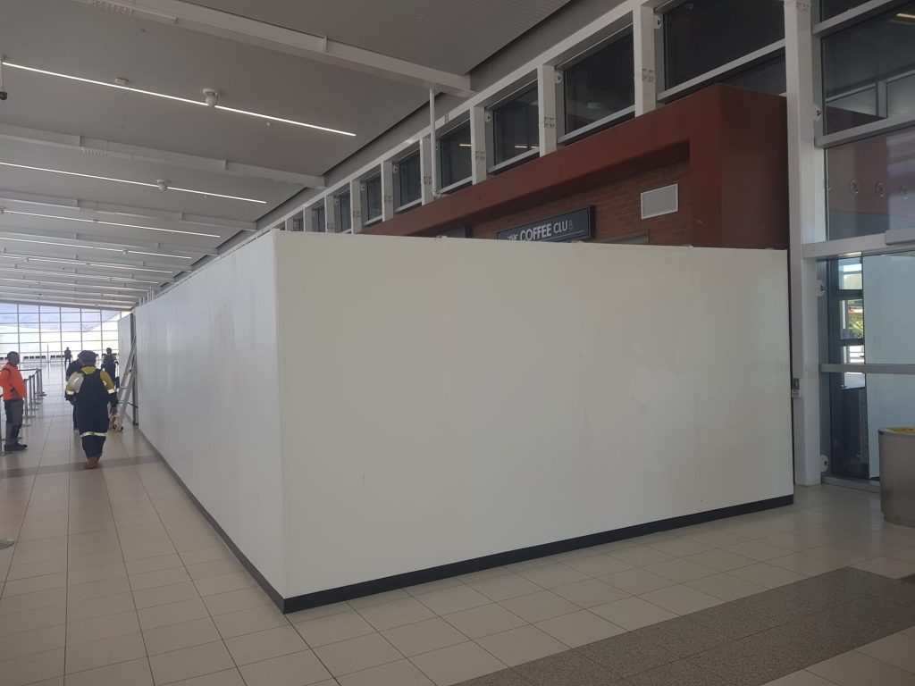 Maintenance projects within shopping centres or commercial buildings frequently use controlled shopfront-style hoarding to isolate work zones while allowing business operations to continue.